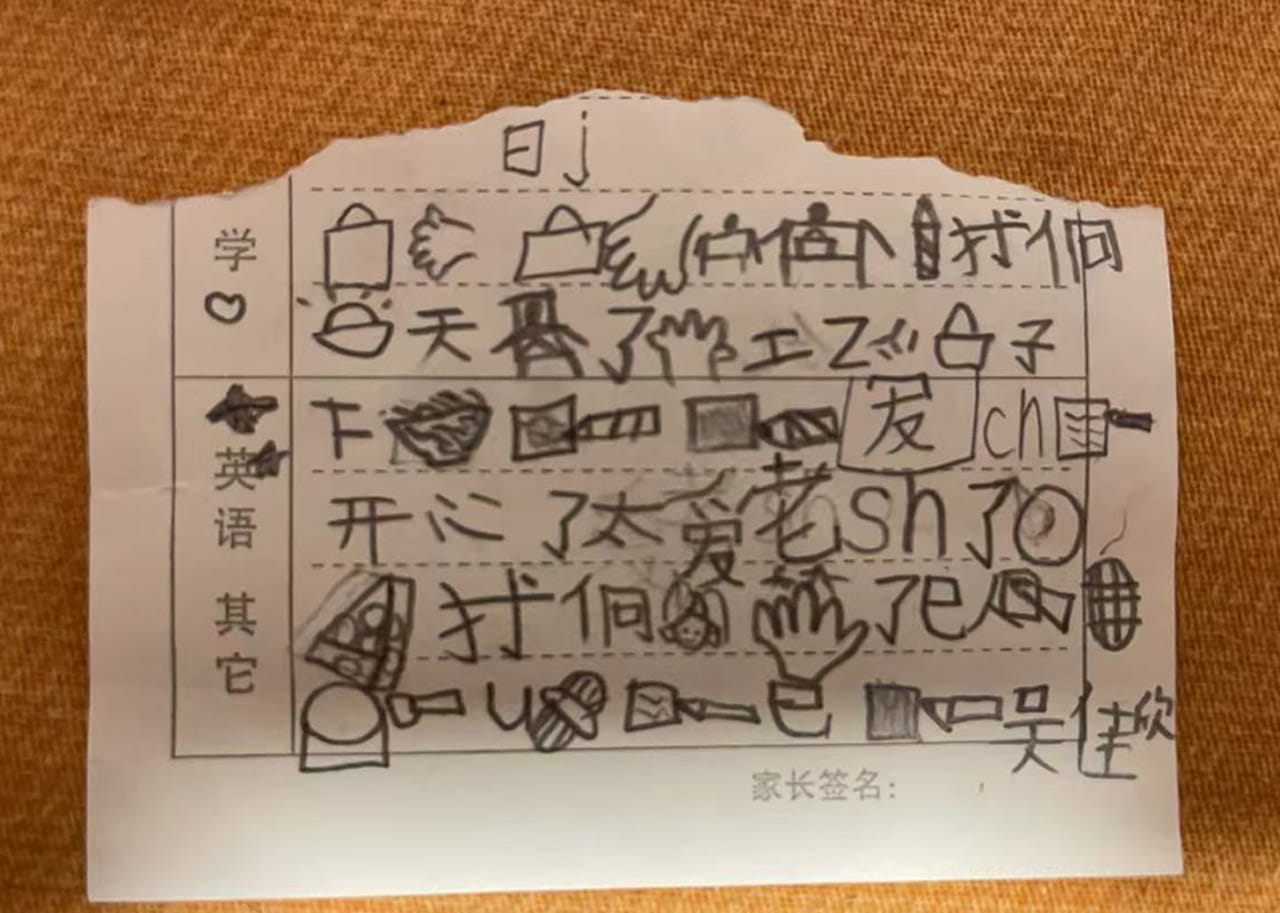 我翻开一看,真的愣住了。本子上没有几个完整的字,全是奇奇怪怪的符号:左边一页画了个简单的手提袋图案,旁边跟着一个金元宝;右边还有各种人形符号,后面跟着两个手掌符号,还有一个哭脸。再往后翻,还有三明治、小蜜蜂、小手、小脚印,各种看不懂的符号,配上各种表情符号。